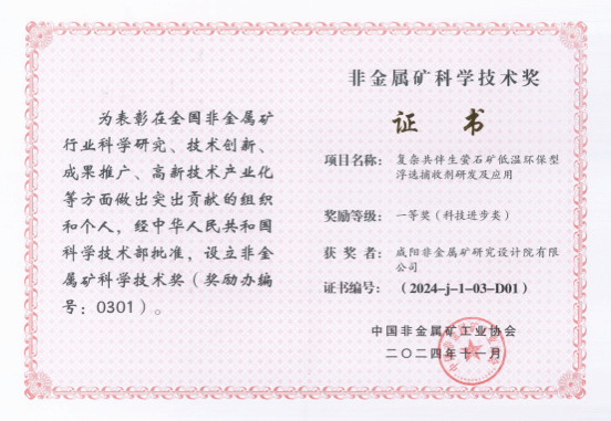 2024年11月6-7日,中國非金屬礦工業(yè)大會在廣東茂名召開,大會進行了“2024年度非金屬礦科學技術(shù)獎”頒獎,其中咸陽非礦院的“復雜共伴生螢石礦低溫環(huán)保型浮選捕收劑研發(fā)及應用”成果獲得科技進步類一等獎、“玻璃纖維用白云石粉研發(fā)與標準制定”成果獲得科技公益類二等獎。