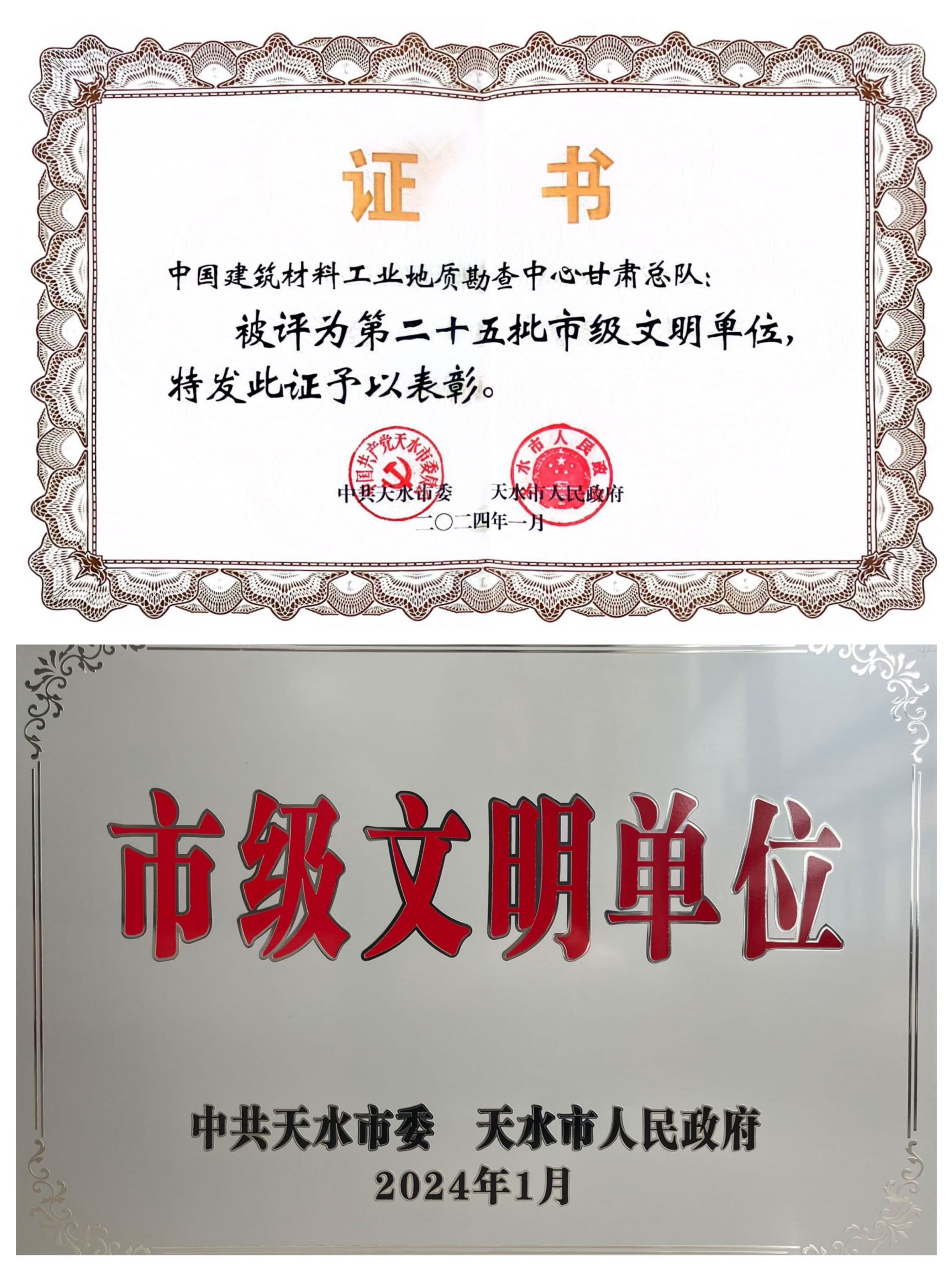 近日,天水市精神文明建設(shè)工作會(huì)議順利召開,會(huì)上表彰了2023年度全市精神文明建設(shè)先進(jìn)縣區(qū)和市級(jí)精神文明建設(shè)先進(jìn)集體和先進(jìn)工作者。中國建筑材料工業(yè)地質(zhì)勘查中心甘肅總隊(duì)榮登榜單,被天水市精神文明建設(shè)指導(dǎo)委員會(huì)評(píng)為天水市 “市級(jí)文明單位”。
