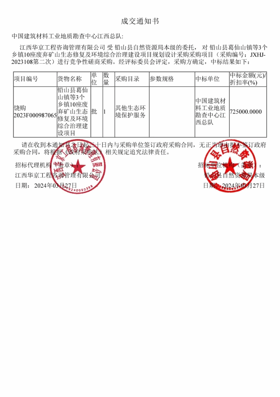 近日,江西總隊(duì)地質(zhì)環(huán)境院接連成功中標(biāo)“鉛山縣地質(zhì)災(zāi)害隱患點(diǎn)工程治理勘查設(shè)計(jì)”和“鉛山縣葛仙山鎮(zhèn)等3個(gè)鄉(xiāng)鎮(zhèn)10座廢棄礦山生態(tài)修復(fù)及環(huán)境綜合治理建設(shè)項(xiàng)目”,合同累計(jì)金額約為400.00萬元。