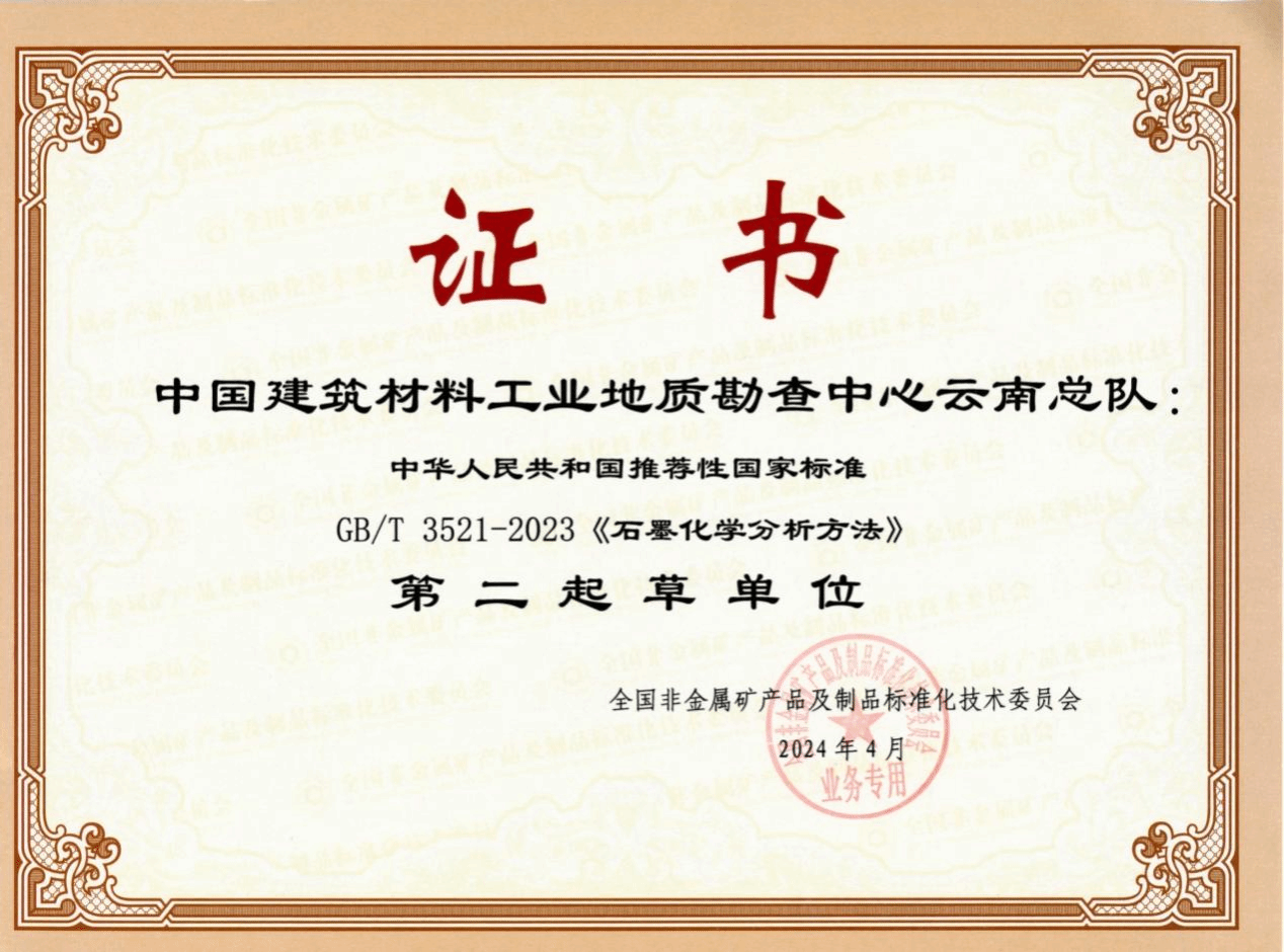 近日,云南總隊獲頒中華人民共和國推薦性國家標(biāo)準(zhǔn)《石墨化學(xué)分析方法》GB/T 3521-2023第二起草單位證書,這是全國非金屬及制品標(biāo)準(zhǔn)化技術(shù)委員會對我隊在石墨領(lǐng)域分析測試業(yè)務(wù)技術(shù)能力的高度認(rèn)可,也意味著我國石墨化學(xué)分析領(lǐng)域在標(biāo)準(zhǔn)化工作方面取得了顯著進(jìn)展。