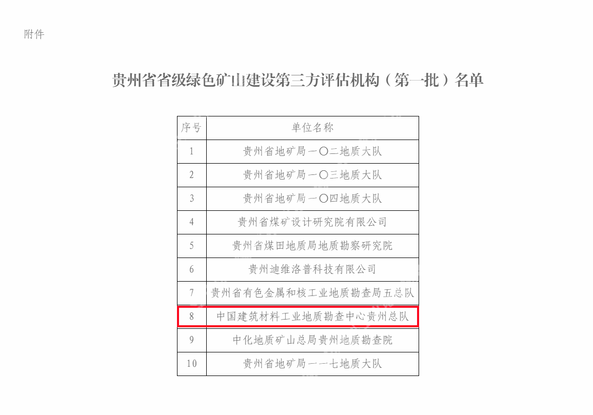 同時,貴州總隊成功入選了貴州省省級綠色礦山建設(shè)第三方評估機構(gòu)。根據(jù)《關(guān)于進一步加強綠色礦山建設(shè)的通知》(自然資規(guī)〔2024〕1號)和《貴州省進一步加強綠色礦山建設(shè)的實施意見》(黔自然資函〔2024〕718號)文件要求,經(jīng)過省自然資源廳組織遴選第三方評估機構(gòu)評估,貴州總隊充分發(fā)揮貴州省綠色礦山建設(shè)主力軍和技術(shù)力量突出的優(yōu)勢,充分準備入庫資料,最終成功入選第一批評估機構(gòu)。