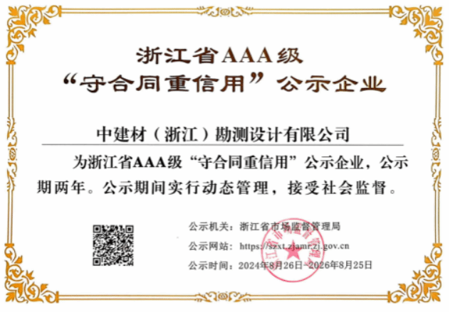 近日,浙江省市場監(jiān)督管理局發(fā)布了《關于公示2024年浙江省AAA級“守合同重信用”企業(yè)的通知》,中建材(浙江)勘測設計(以下簡稱“公司”)榮獲浙江省AAA級“守合同重信用”企業(yè)稱號。AAA級也是“守合同重信用”企業(yè)評定中的最高等級,具有最高的權威性和含金量。