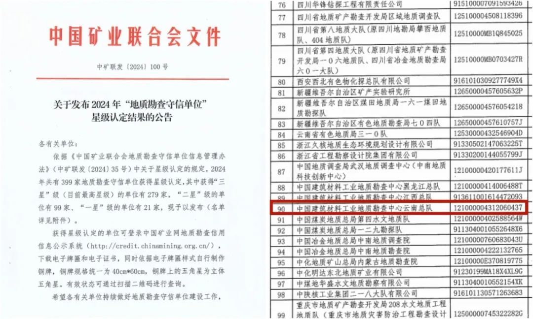 近日,中國礦業(yè)聯(lián)合會下發(fā)《關(guān)于發(fā)布2024年“地質(zhì)勘查守信單位”星級認(rèn)定結(jié)果的公告》(中礦聯(lián)發(fā)﹝2024﹞100號),我隊榮獲2024年度“地質(zhì)勘查單位”星級認(rèn)定。