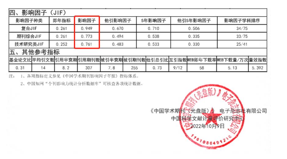 近日,中國知網(wǎng)“中國學(xué)術(shù)期刊影響因子年報(bào)(自然科學(xué)與工程技術(shù)·2022版)”權(quán)威發(fā)布?!吨袊墙饘俚V工業(yè)導(dǎo)刊》期刊復(fù)合影響因子達(dá)0.949,比上一年增長0.317,增幅50.16%,在75種礦山工程技術(shù)類期刊中排第34位;期刊綜合影響因子0.773,比上一年增長0.22,增幅39.78%,排第33位。兩項(xiàng)影響因子均為創(chuàng)刊以來最高值,學(xué)科排序較2018年分別提升18名和22名。期刊影響力指數(shù)(CI)學(xué)科排序較上一年提升7名。此外,期刊技術(shù)研究影響因子、總被引頻次、WEB下載量等各項(xiàng)參考指標(biāo)均有顯著提升。