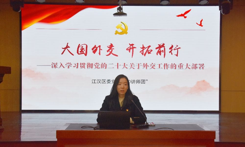 江漢區(qū)委黨?!?0講師團(tuán)”盧天謠老師給現(xiàn)場(chǎng)的黨員們作了題為《大國(guó)外交 開(kāi)拓前行——深入學(xué)習(xí)貫徹黨的二十大關(guān)于外交工作的重大部署》的專題授課。從全面推進(jìn)中國(guó)特色大國(guó)外交的新成就、百年未有之大變局加速演進(jìn)的新形勢(shì)以及堅(jiān)持胸懷天下、立志千秋偉業(yè)的新征程等三個(gè)方面入手,深入講述了黨的十八大以來(lái),在習(xí)近平總書(shū)記擘畫(huà)引領(lǐng)和親力親為下,中國(guó)特色大國(guó)外交奮進(jìn)新時(shí)代新征程,展現(xiàn)新?lián)?dāng)新風(fēng)范,與各國(guó)命運(yùn)與共、共謀發(fā)展的生動(dòng)故事。黨員們一致認(rèn)為此次專題黨課主題鮮明、內(nèi)涵豐富,受益匪淺。