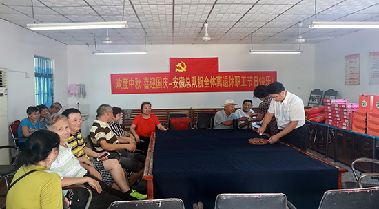 月到圓時情意濃。為弘揚總隊企業(yè)文化,讓離退休職工充分感受到總隊大家庭的溫暖與關懷,2018年9月19日,正值“雙節(jié)”前夕,總隊紀委書記陳文、工會主席徐劍萍代表總隊領導與離退休職工歡聚一堂,共慶佳節(jié)。